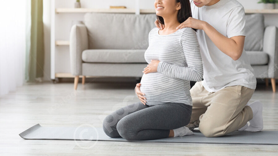 Asian husband massaging shoulders of pregnant wife while sitting together on yoga mat in living room at home