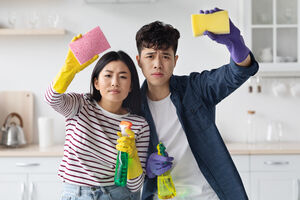 Asian couple wearing rubber gloves holding sponges and spray bottles while standing together in kitchen at home