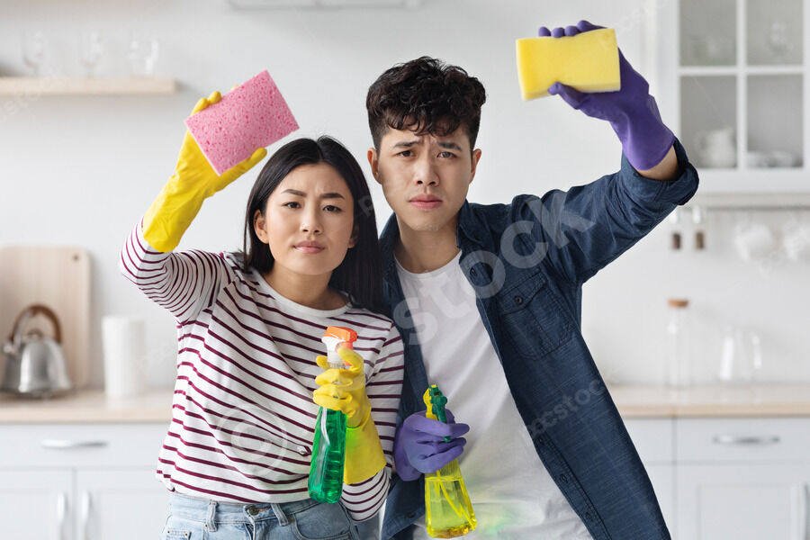 Asian couple wearing rubber gloves holding cleaning spray bottles, sponge and cloth while standing back to back with crossed arms in kitchen at home