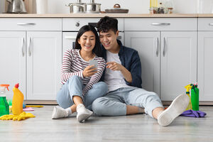 Asian couple sharing smartphone sitting close together on floor near cleaning tools in kitchen at home