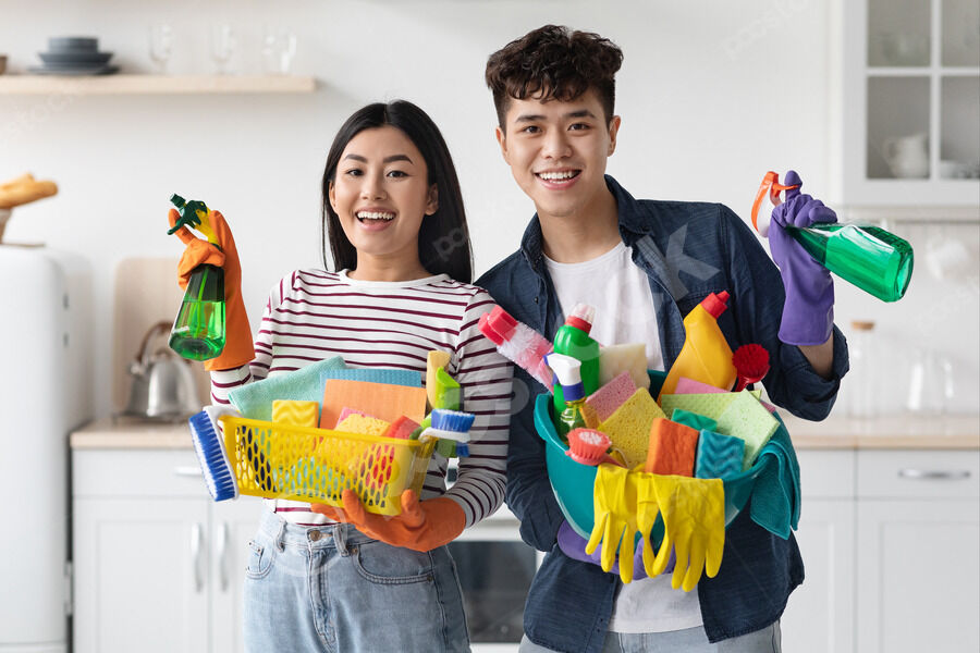 Asian couple wearing rubber gloves holding spray bottles and baskets with cleaning tools while standing together in kitchen at home