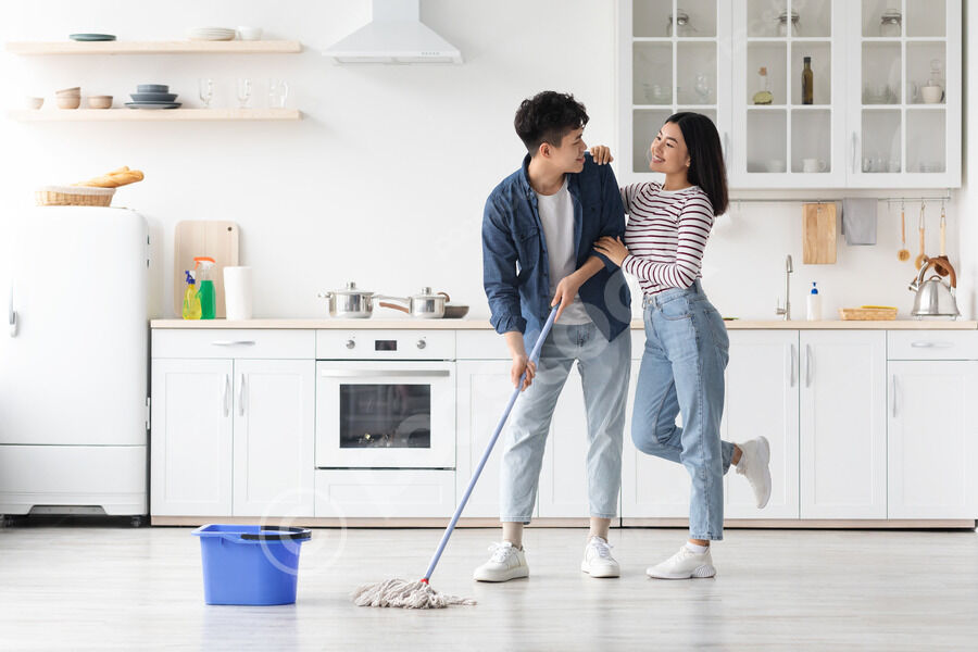 Asian wife hugging her husband mopping floor while standing together in kitchen at home