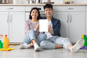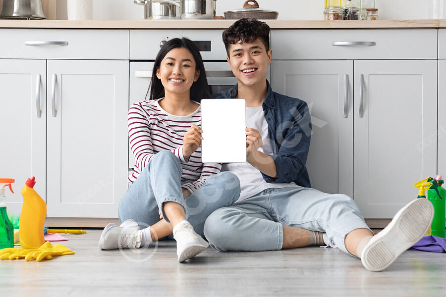 Asian couple showing tablet with blank screen while sitting close together on floor near cleaning tools in kitchen at home