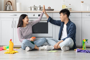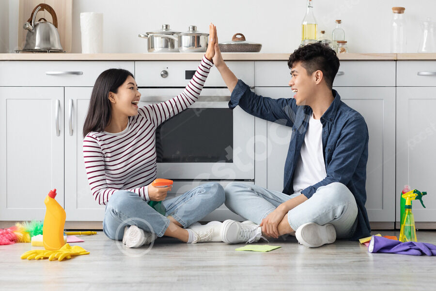 Asian couple giving high five to each other while sitting with crossed legs on floor near cleaning tools in kitchen at home