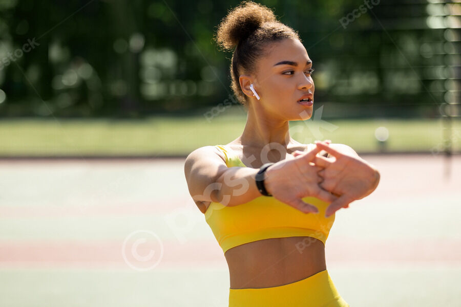 Smiling Armenian woman jumping up and touching legs with hand against yellow background in studio