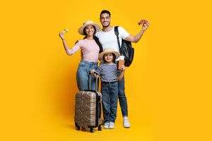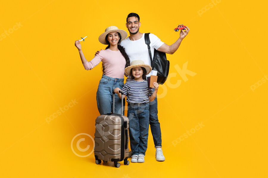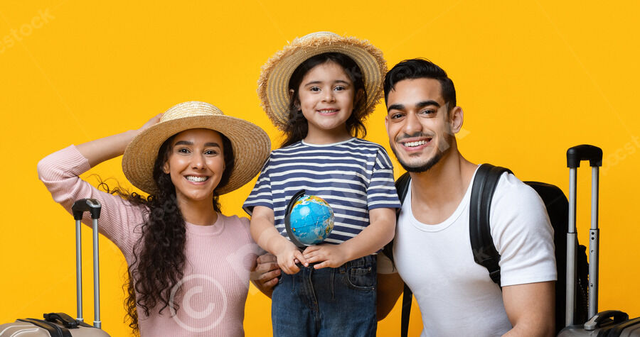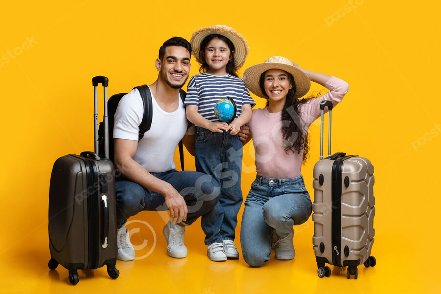 Arab girl wearing straw hat holding small globe standing between her parents crouching with their luggage against yellow background in studio