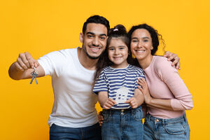 Arab family holding paper house and keys celebrating new property while standing together against yellow background in studio
