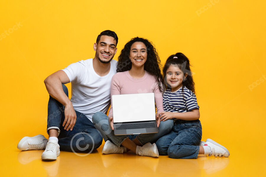 Arab woman with curly hair showing laptop with white empty screen sitting with her husband and daughter on floor over yellow background in studio