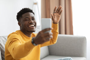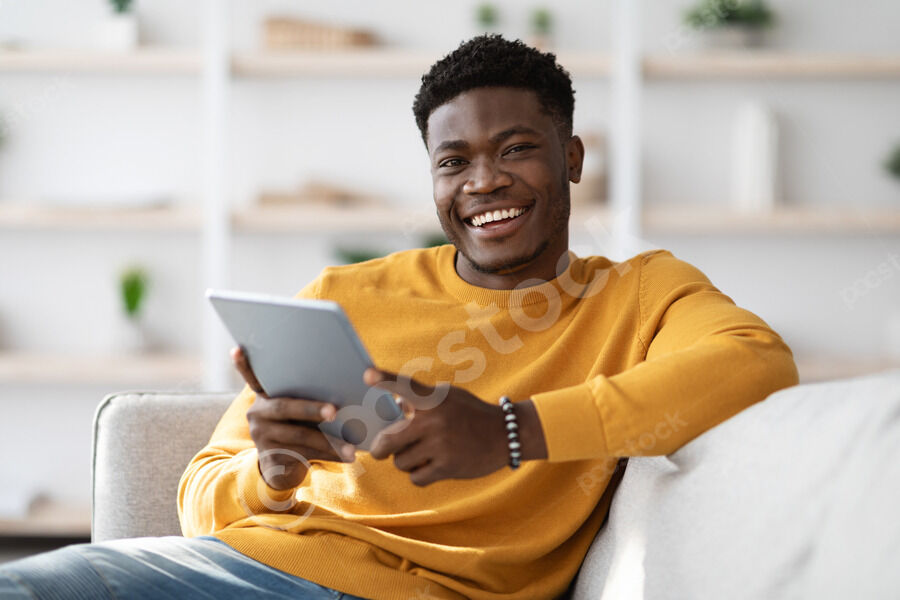Black mother using tablet with baby son on her lap sitting on sofa at home