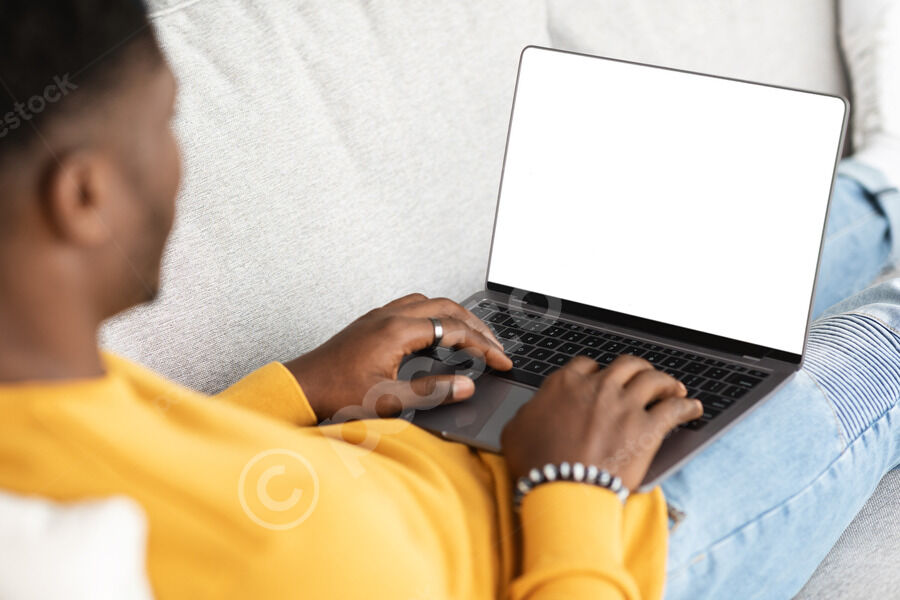 Black mother using laptop with baby son on her lap sitting on sofa at home