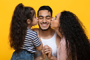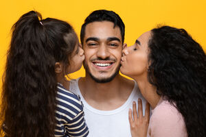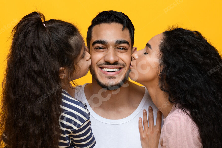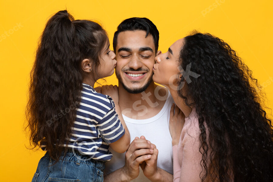 Arab mother and daughter kissing father on cheeks while standing against yellow background in studio