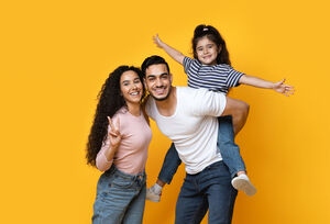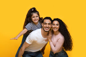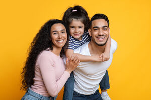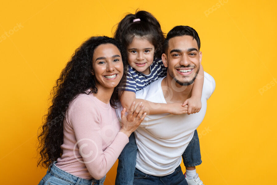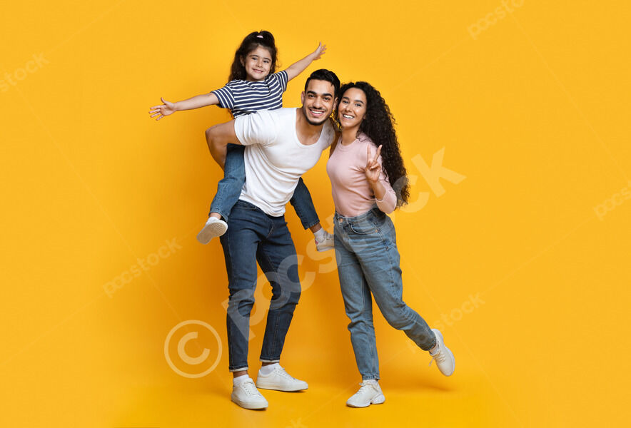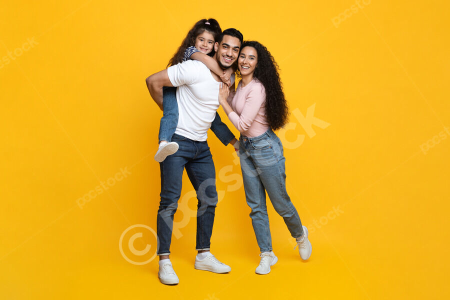 Arab father giving piggyback ride to his daughter while standing with his wife against yellow background in studio