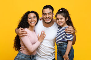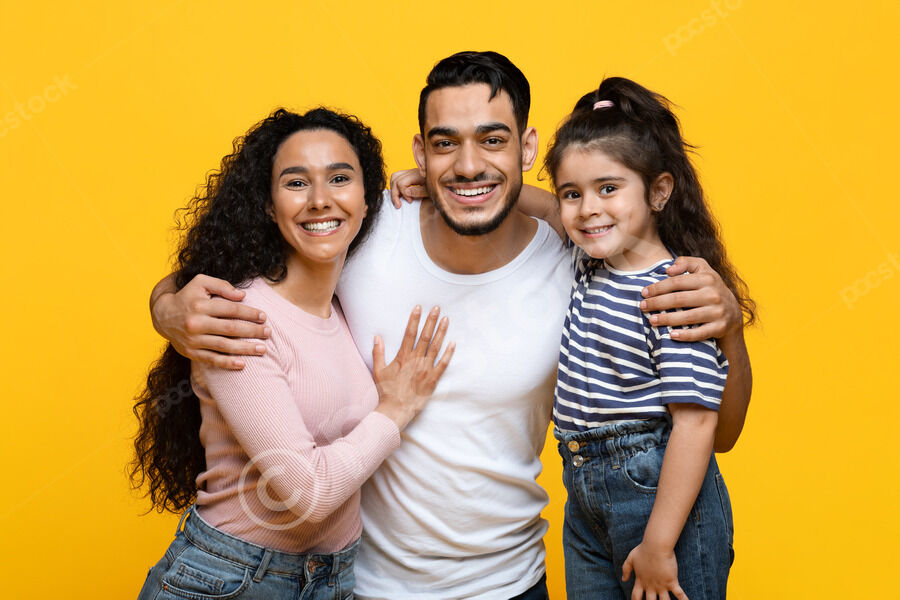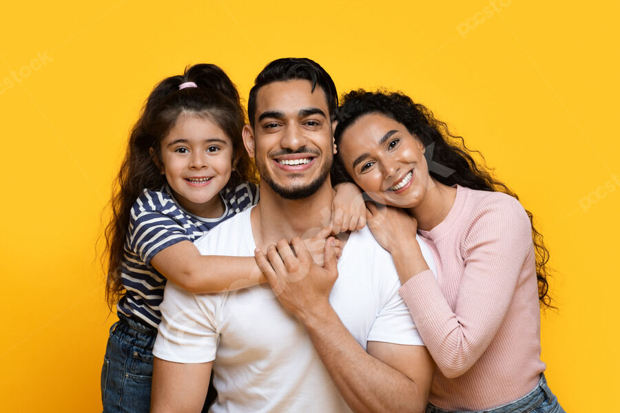 Arab father with beard wearing white shirt hugging his wife and daughter while standing against yellow background in studio
