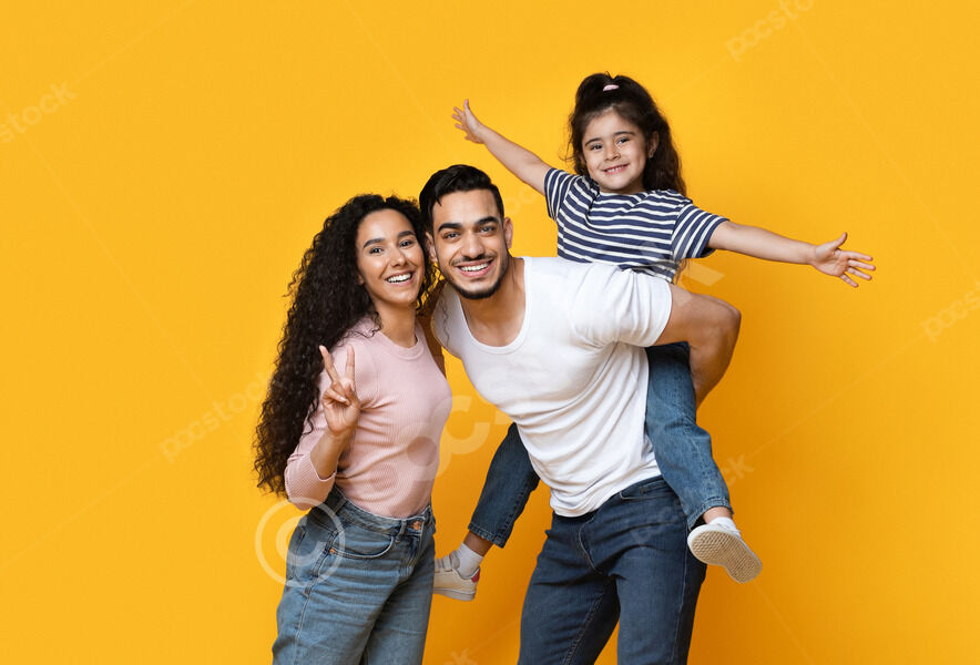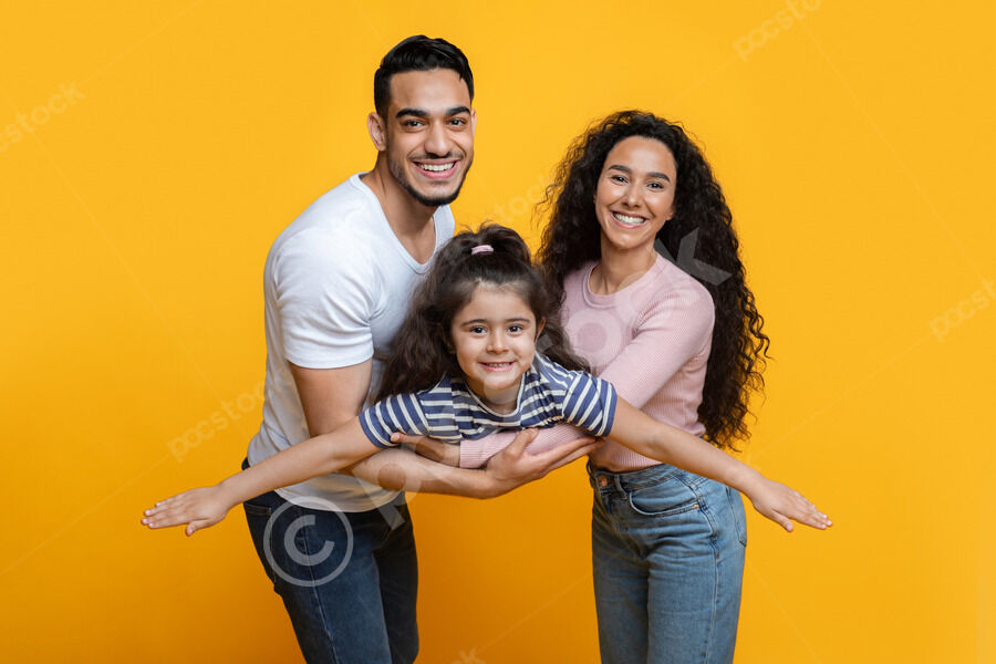 Arab parents having fun playing and carrying their daughter spreading her hands pretending to fly against yellow background in studio