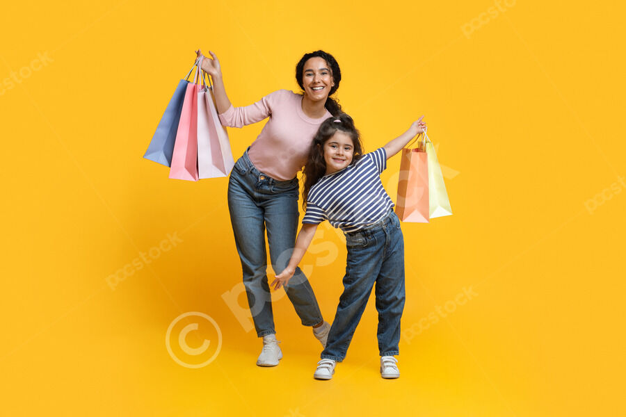 Arab mother and daughter holding colorful shopping bags and smiling standing together against yellow background in studio