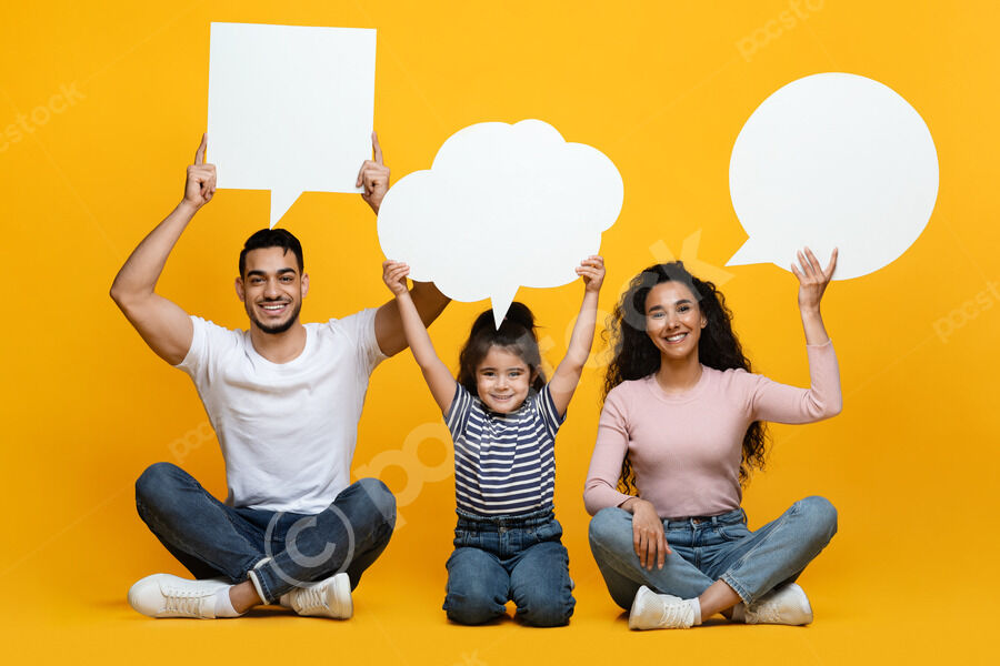 Arab family holding different speech bubbles above their heads while sitting together on yellow background in studio