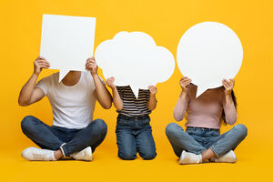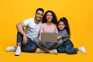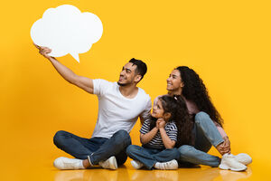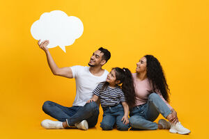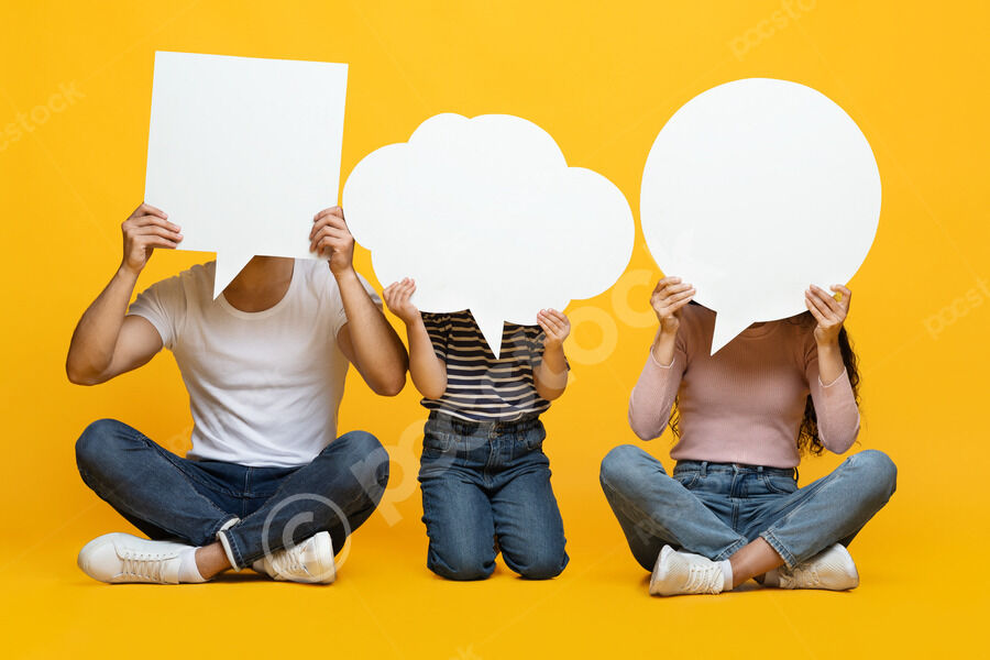 Arab family holding different speech bubbles in front of their faces while sitting together on yellow background in studio