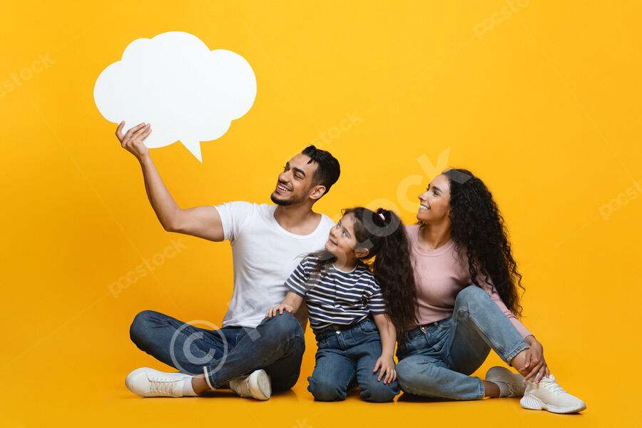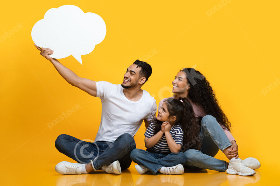 Arab father holding speech bubble sitting with his wife and daughter on yellow background in studio