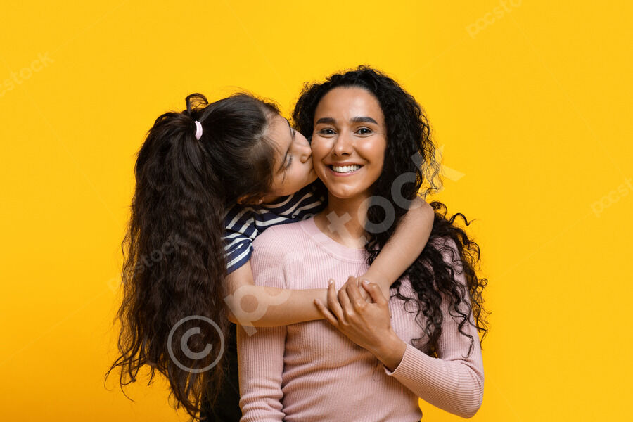 Arab girl kissing and hugging her mother from behind sitting against yellow background in studio