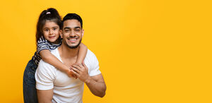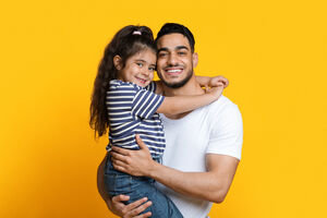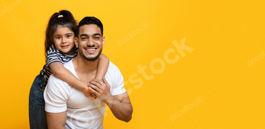 Arab father carrying his daughter and smiling while standing against yellow background in studio