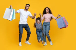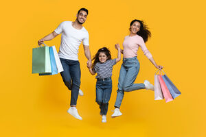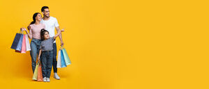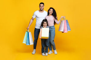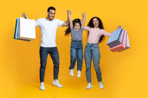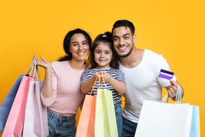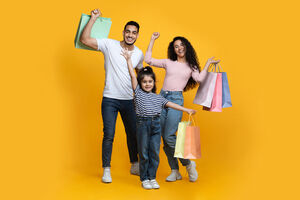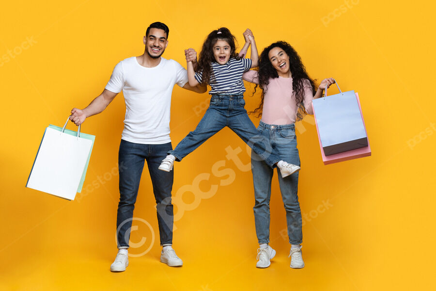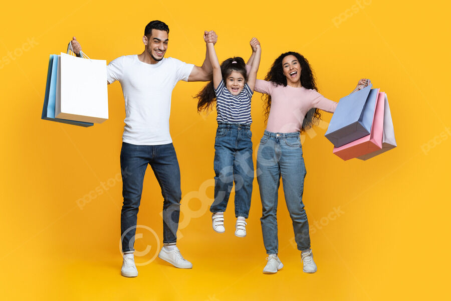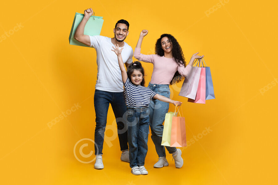 Arab family raising their arms and holding colorful shopping bags while standing together against yellow background in studio