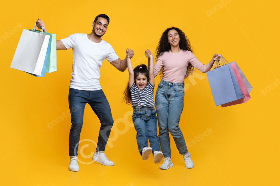 Cheerful Arab family holding hands while jumping together with colorful shopping bags against yellow background in studio