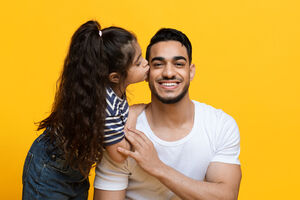 Arab girl hugging her father from behind sitting against yellow background in studio