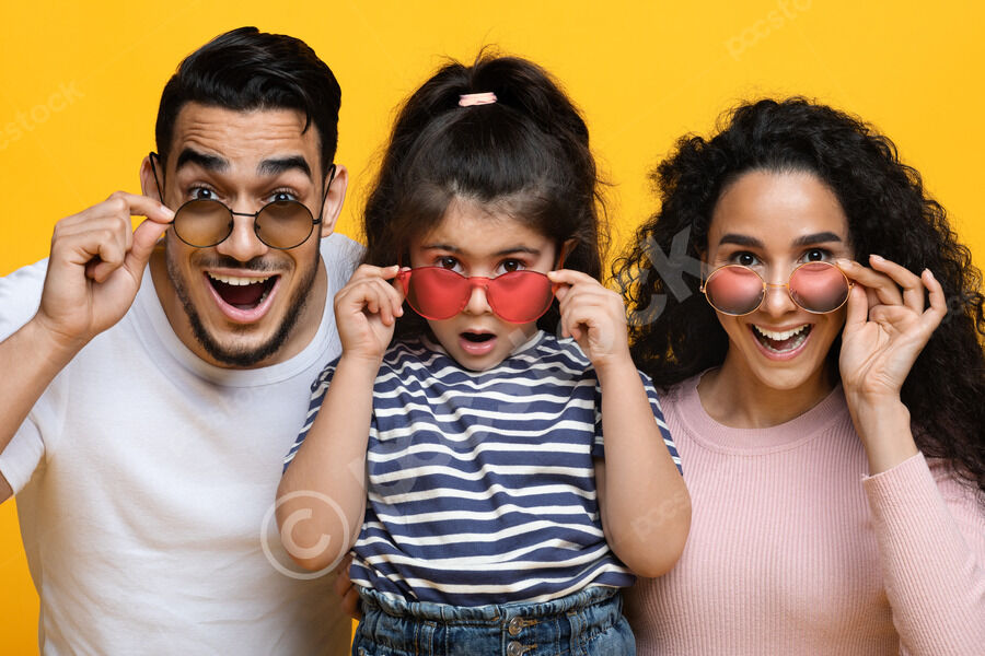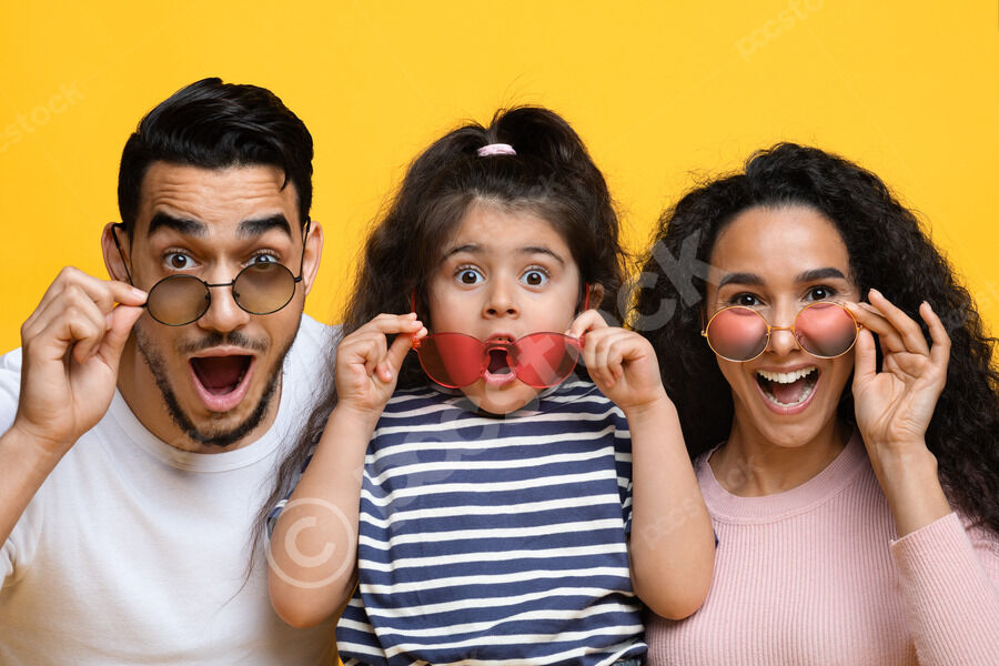 Shocked Arab family touching and looking over their sunglasses while standing against yellow background in studio