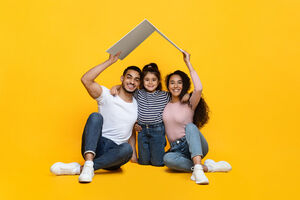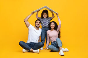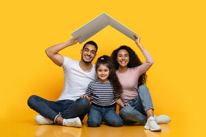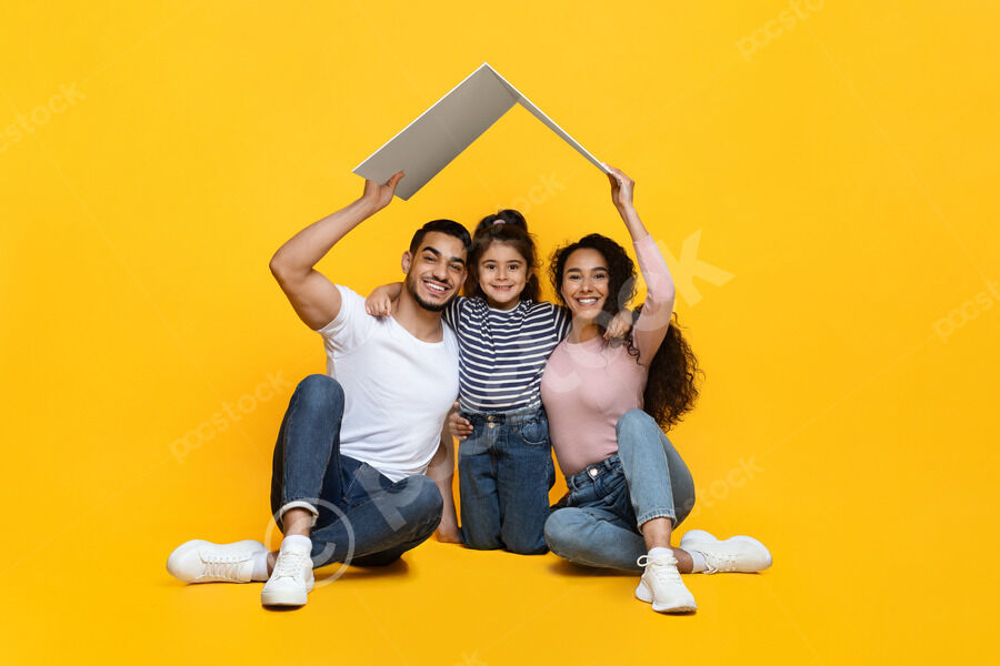 Arab family holding carton roof above their heads sitting on yellow background in studio