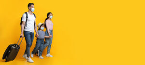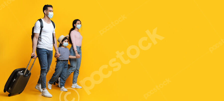 Arab family wearing face masks holding hands and pulling their luggage while walking against yellow background in studio