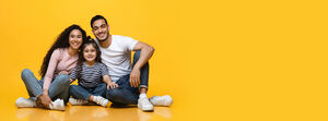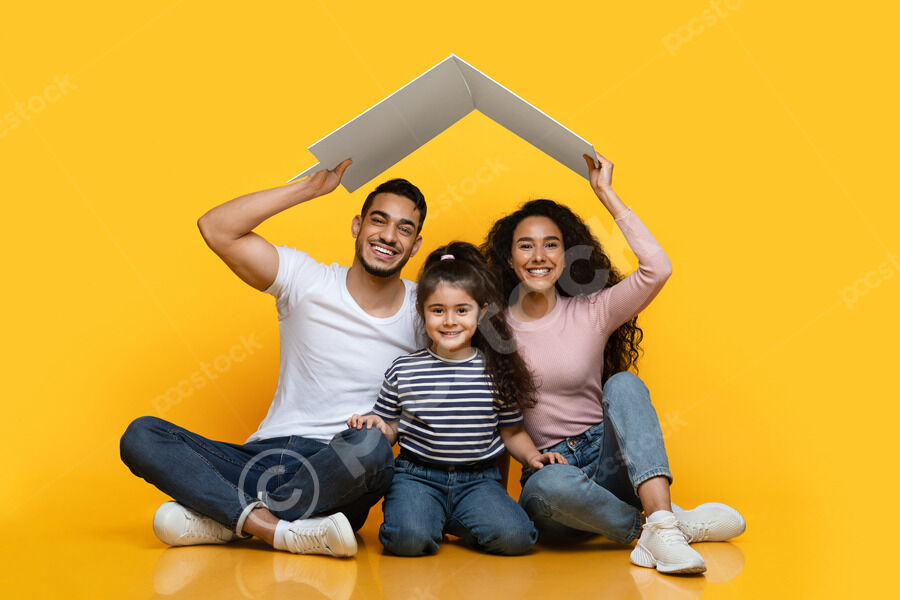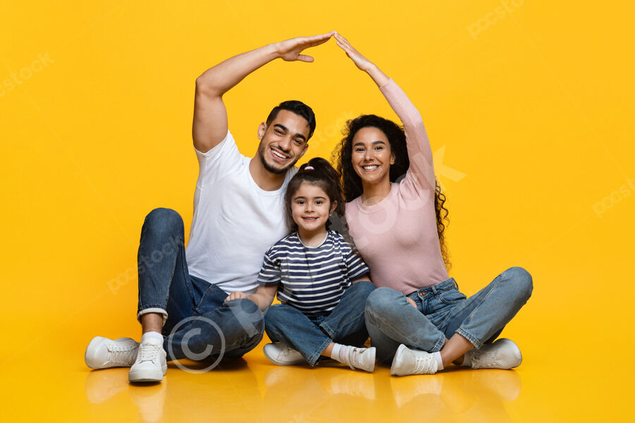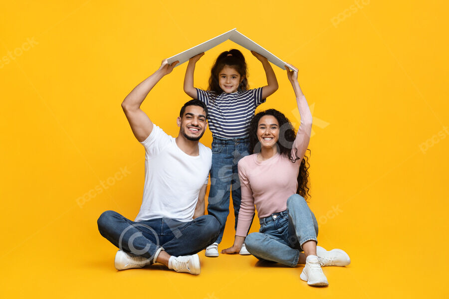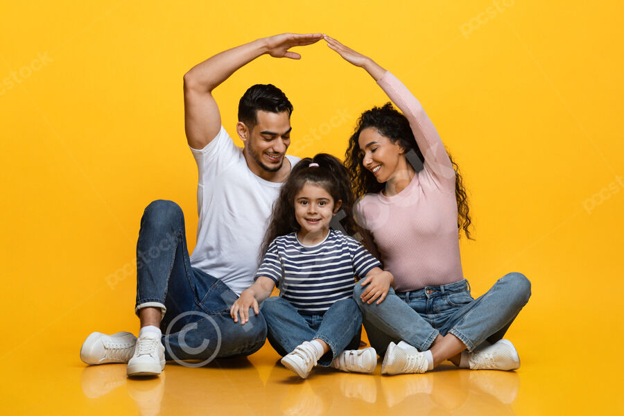 Arab parents making symbolic roof of hands above their little daughter while sitting together on floor over yellow background in studio