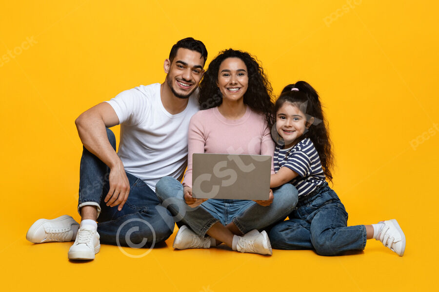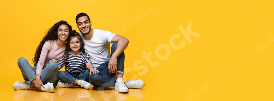 Arab family smiling while sitting close together on floor over yellow background in studio