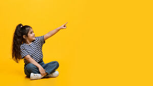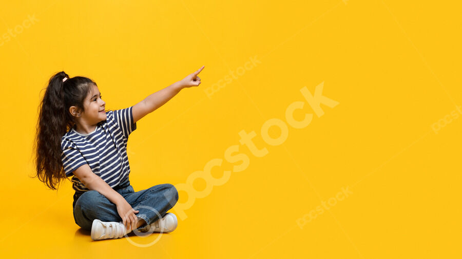 Arab girl wearing striped shirt pointing and looking away while sitting with crossed legs on floor on yellow background in studio