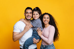 Arab father carrying daughter while standing with his wife against yellow background in studio