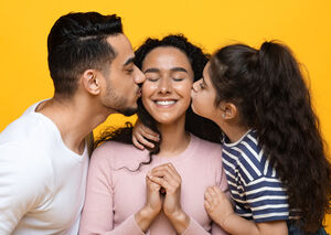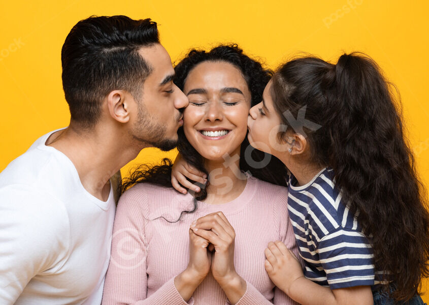 Arab father and daughter kissing mother on her cheeks while standing against yellow background in studio