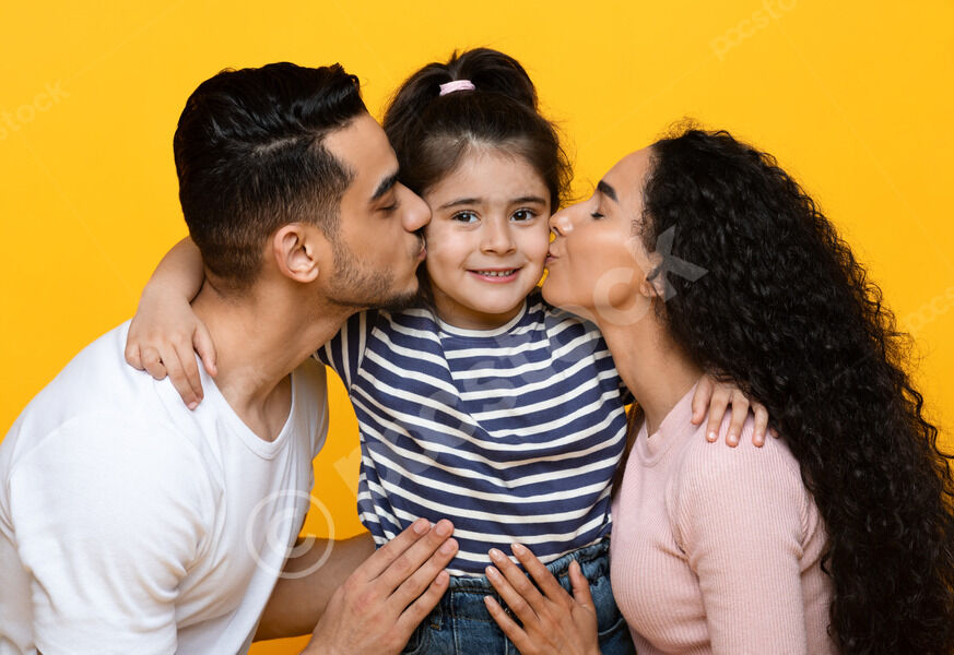 Arab parents kissing their daughter on cheeks embracing against yellow background in studio