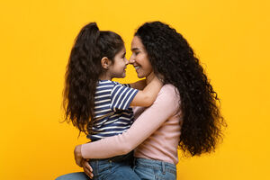 Arab mother and daughter embracing and touching noses while sitting against yellow background in studio