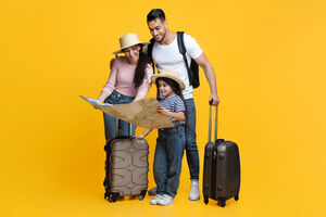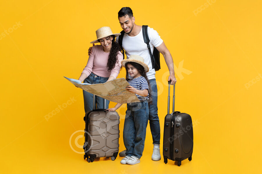 Arab family holding and looking at map while standing with their luggage against yellow background in studio
