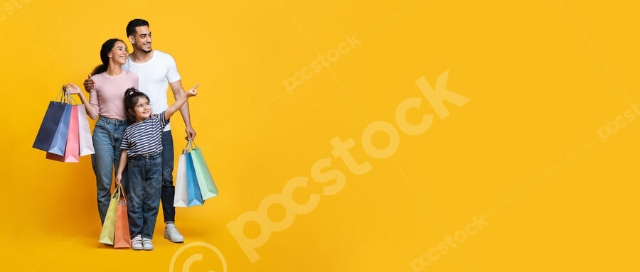 Arab girl pointing away showing something to her parents holding colorful shopping bags while standing together against yellow background in studio