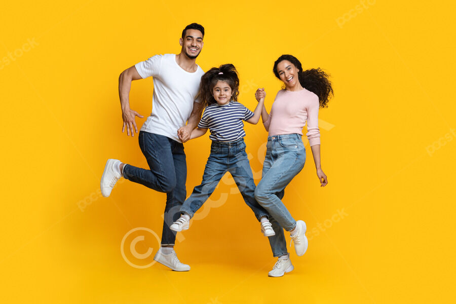 Arab family having fun holding hands while jumping together against yellow background in studio