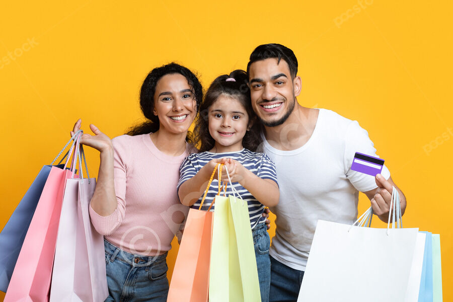 Arab family holding colorful shopping bags and credit card while standing together against yellow background in studio