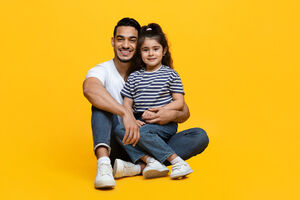 Arab father sitting on floor with his daughter and smiling on yellow background in studio