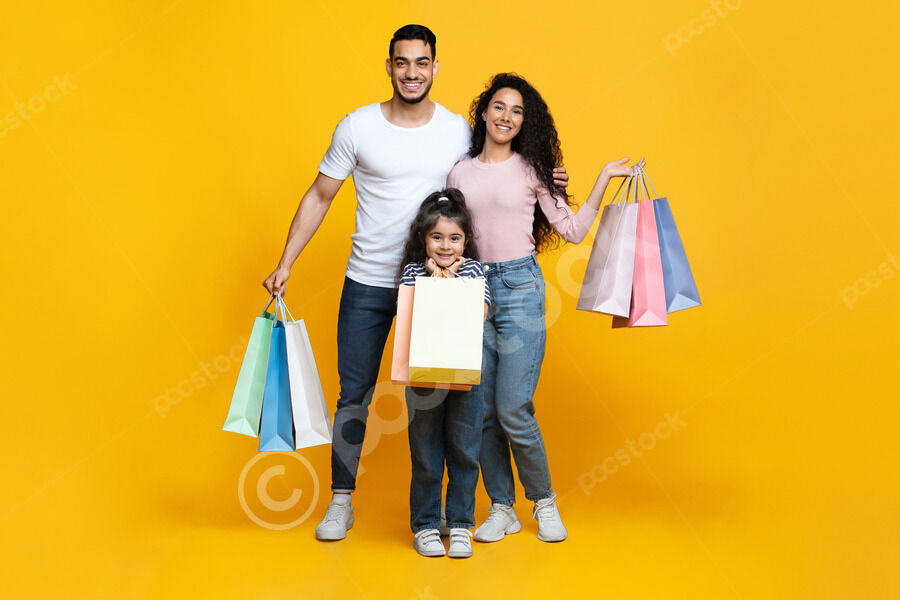 Arab family holding colorful shopping bags and smiling while standing together against yellow background in studio