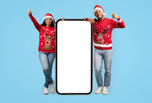 Smiling Black woman with curly hair showing arm with band aid and using smartphone in living room at home