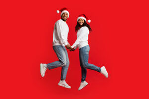 Smiling Black woman with curly hair wearing white robe standing with cream on hands in front of mirror at home