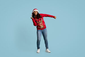 Smiling Black woman with curly hair showing arm with band aid in living room at home
