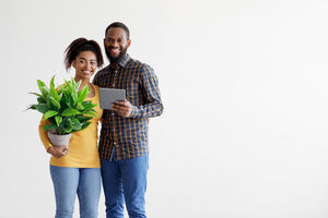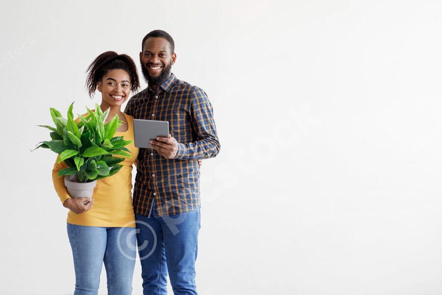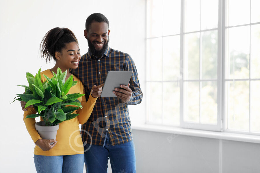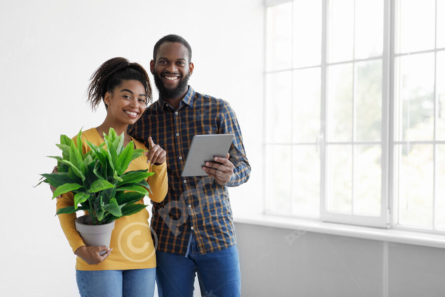 Black couple holding tablet and potted plant smiling while standing near window in their new home