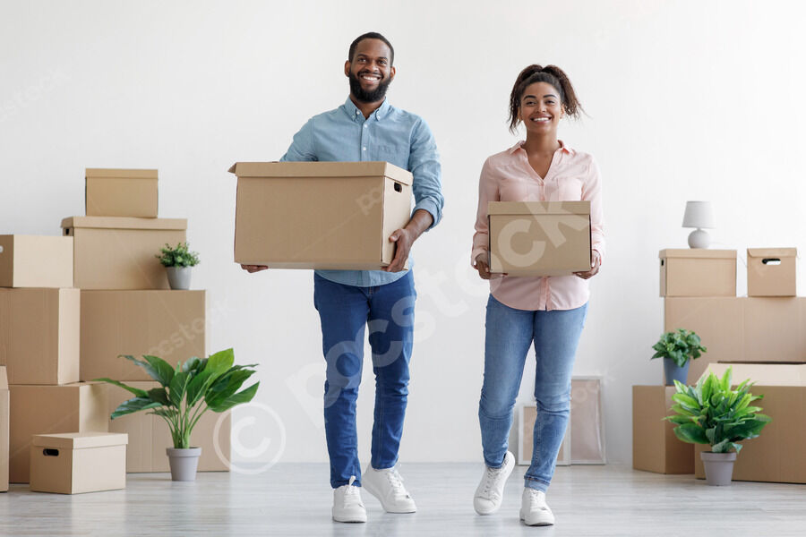 Black couple carrying cardboard boxes while walking and moving into their new home