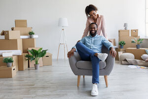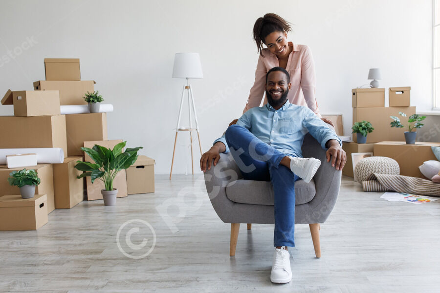 Black man with beard sitting in armchair with his wife standing behind him in living room with cardboard boxes in their new home