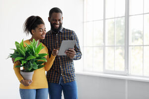 Black couple holding tablet and potted plant looking at each other while standing near window in their new home